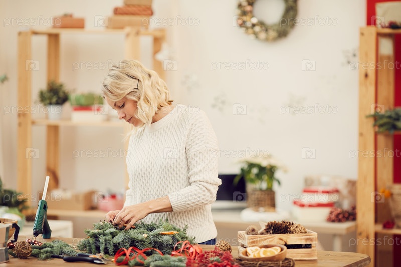 Серьезная квалифицированная молодая женщина в белом свитере, стоящая за столом и работающая с естественными украшениями в студии рождественских венков