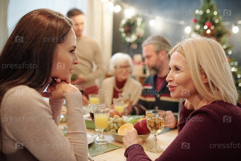 Молодые и зрелые женщины обсуждают что-то, подается праздничный стол