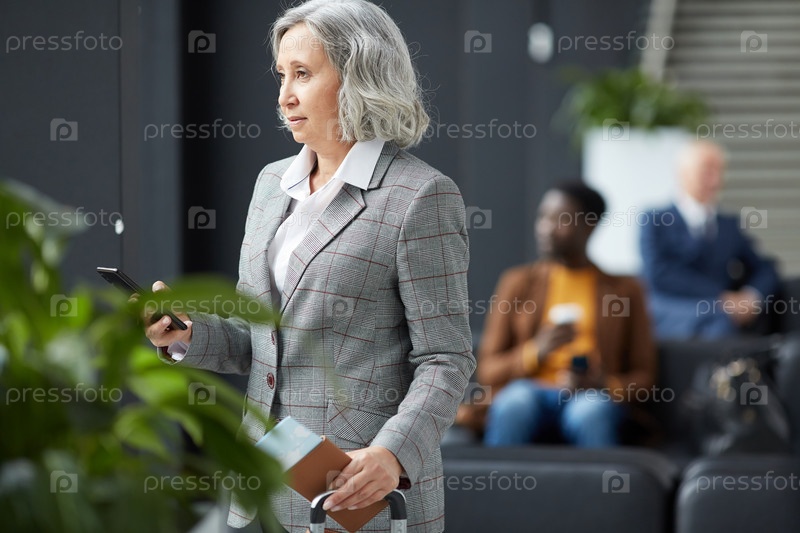 Вдумчивая седовая леди в зоне ожидания