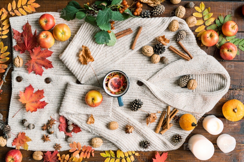 Осенний состав спелых фруктов, листьев, специй, свечей, напитка, орехов и конусов