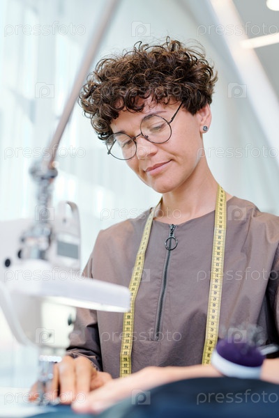 Красивая молодая швейщица в очках, работающая над новой модной коллекцией