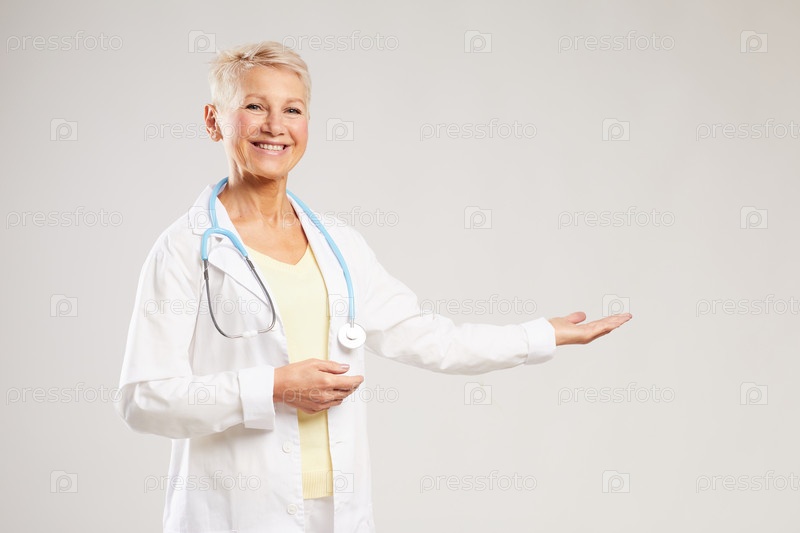 Веселая, взволнованная зрелая женщина-врач в белом пальто стоит на пустом фоне и жестикулирует руками, рекламируя медицинскую клинику