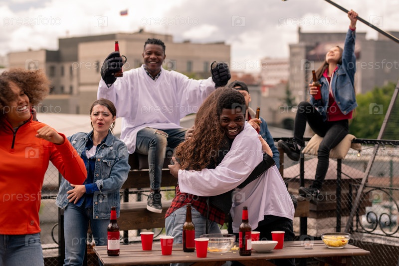 Молодые межкультурные болельщики хоккея празднуют победу своей любимой команды