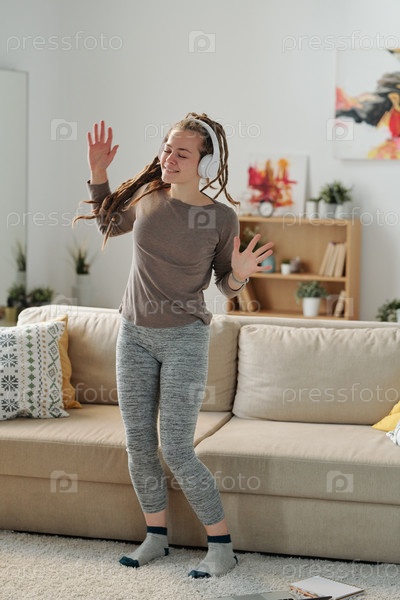 Милая веселая девушка в спортивной одежде, танцующая под музыку на наушниках дома