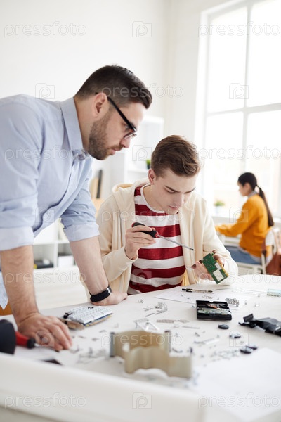Серьезный красивый молодой учитель в очках, опирающийся на стол и дающий советы ученику на уроке робототехники