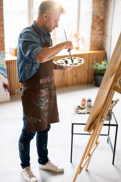 Художник средних лет в повседневной одежде и фартуке, смешивающий цвета на палитре