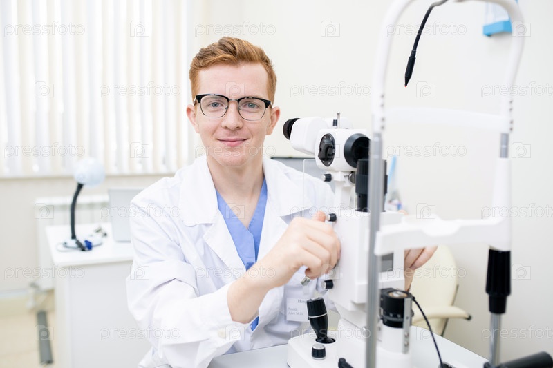 Счастливый молодой стажер в белом халате и очках смотрит на вас по рабочему месту
