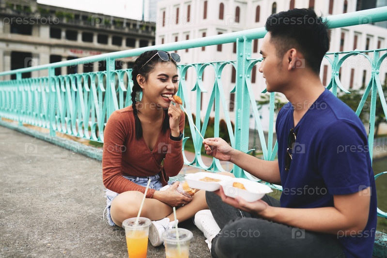 Молодая пара ест фаст-фуд на свежем воздухе