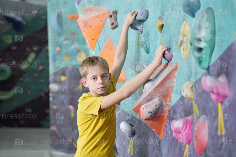 Активный школьник в желтой футболке хватается за искусственные камни на скалолазной стене
