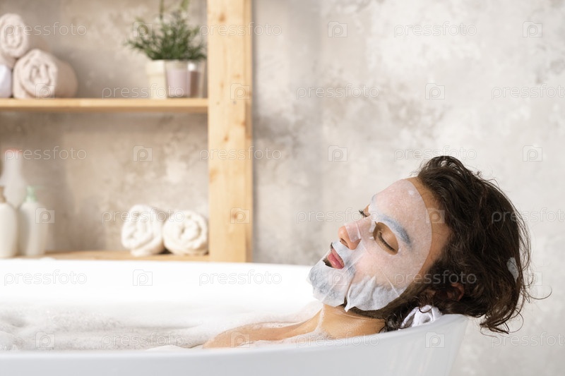 Спокойный и расслабленный молодой человек с маской для лица наслаждается горячей ванной со пеной