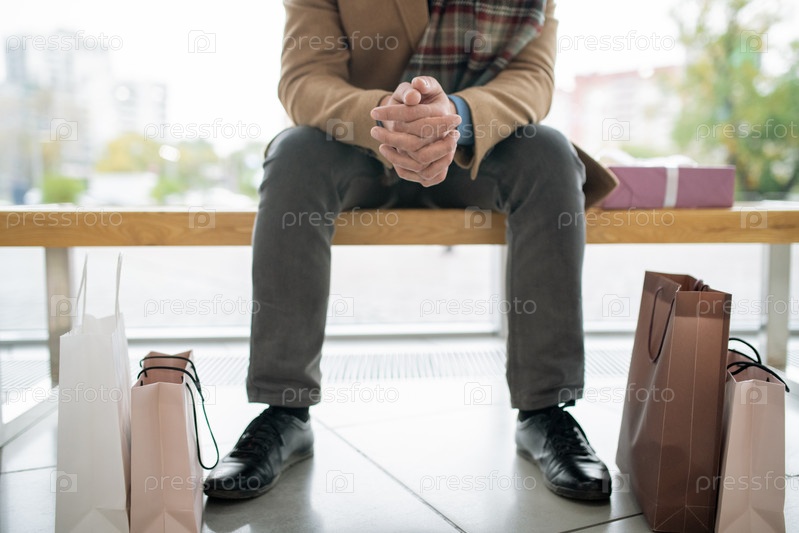 Низкая часть молодого стильного мужчины в джинсах и пальто, сидящего на скамейке в торговом центре
