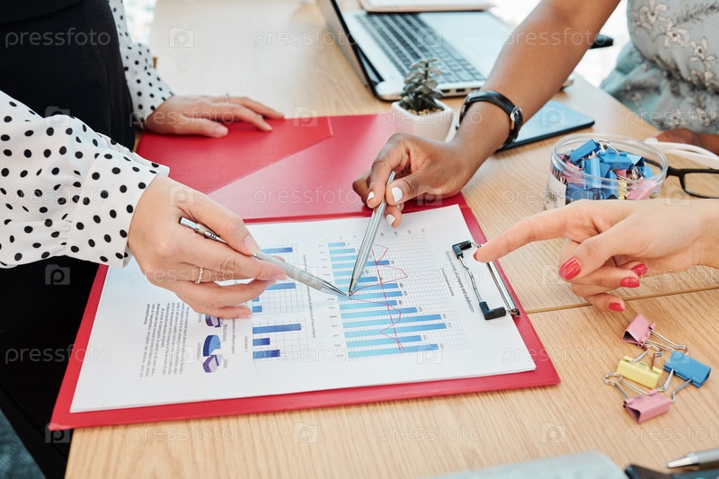 Деловая женщина указывает на самую низкую точку в диаграмме
