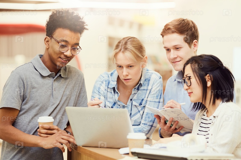 Группа задумчивых молодых студентов из разных этнических групп, стоящих за столом и использующих Wi-Fi в библиотеке во время поиска информации на ноутбуке