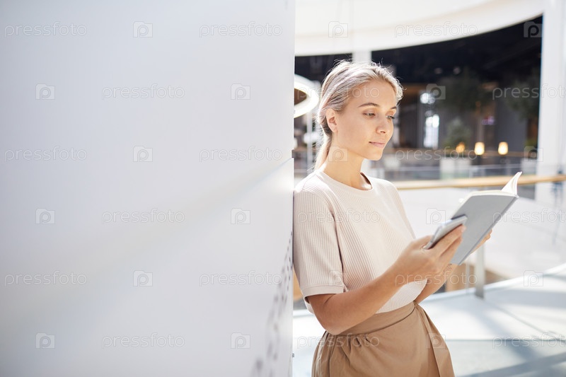 Серьезная мыслящая молодая женщина с конским хвостом, опирающаяся на стену в вестибюле и читающая интересную книгу