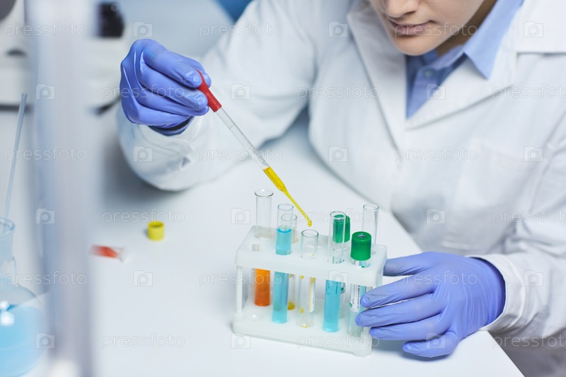 Близкий план занятой химической женщины в голубых резиновых перчатках, сидящей за столом со стойкой и сбрасывающей реагент в пробирку во время исследования образца в лаборатории