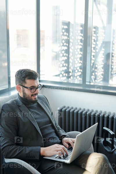 Молодой успешный бизнесмен в костюме сидит на кресле перед ноутбуком