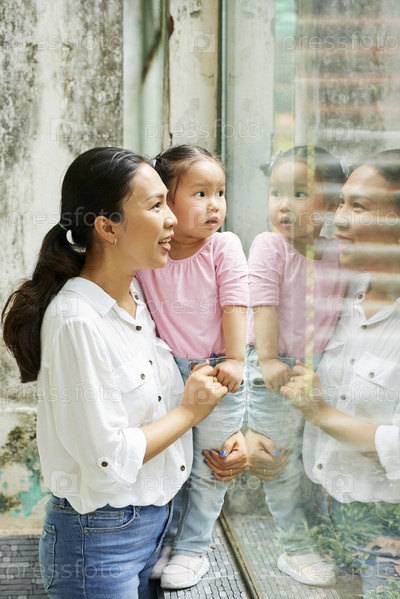 Взволнованные мать и дочь в зоопарке