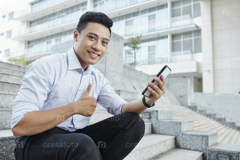 Веселый предприниматель со смартфоном