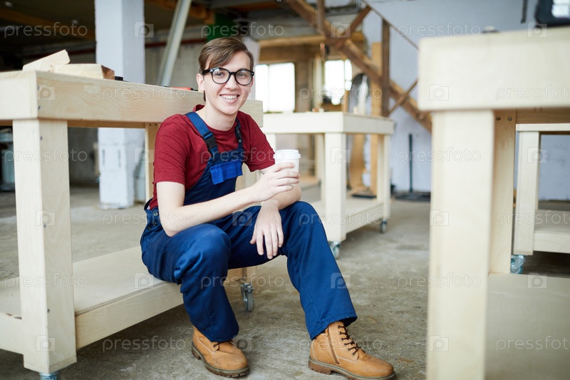 Позитивный молодой плотник пьет кофе