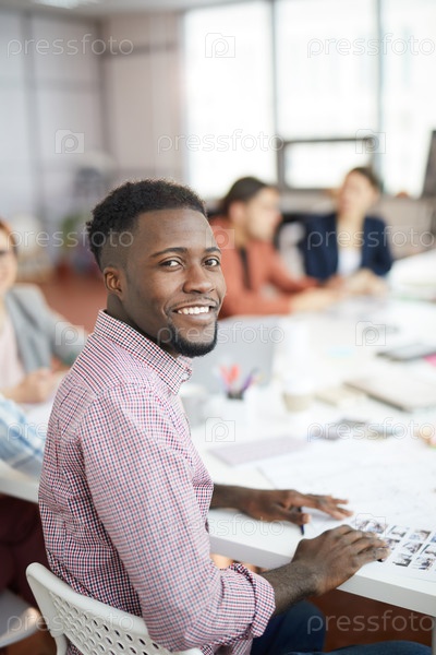 Улыбающийся афроамериканец позирует в продюсерском агентстве