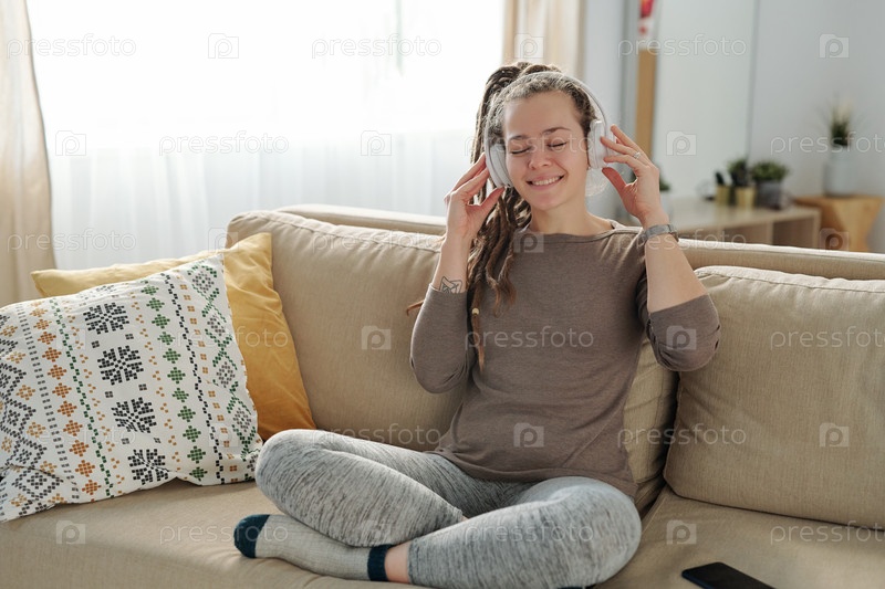 Современная молодая женщина с дредоликами наслаждается музыкой в наушниках