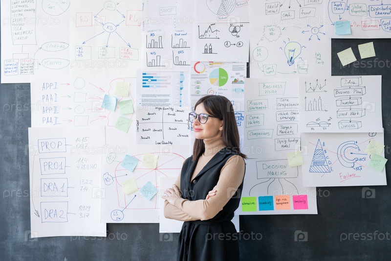 Молодая успешная женщина-экономист со скрещенными руками, стоящая у доски