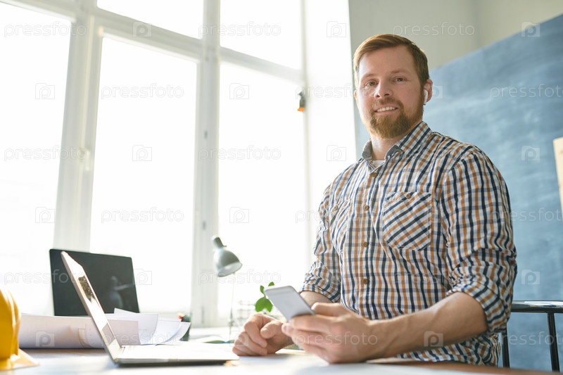 Веселый уверенный красивый бородатый инженер в беспроводных наушниках сидит за столом и использует смартфон и ноутбук, работая в собственной студии