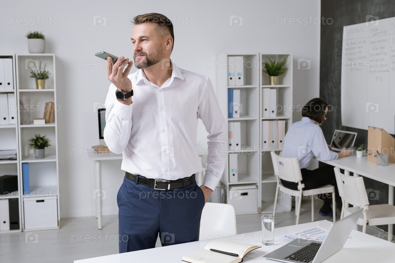 Успешный предприниматель в формальной одежде записывает голосовое сообщение на смартфоне