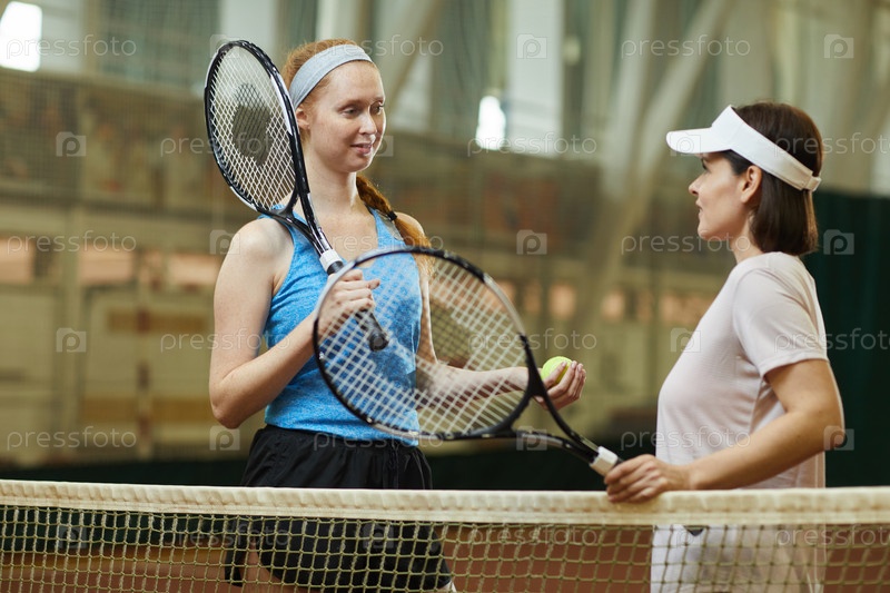 Молодые теннисистки с ракетками стоят у сетки и обсуждают матч вместе на современном крытом корте
