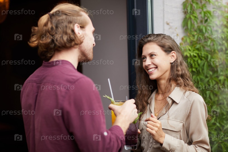 Молодая пара беседует на открытом воздухе у кафе