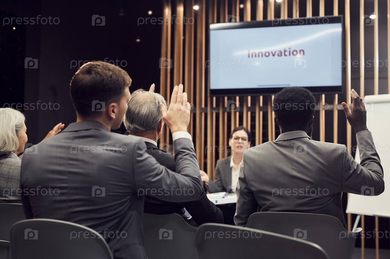 Задний вид бизнес-участников, которые поднимают руки, задавая вопросы об инновациях спикеру конференции