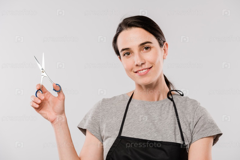 Красивая женская парикмахерша с ножницами смотрит на тебя со зубчатой улыбкой