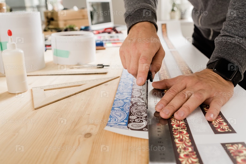 Руки молодого ремесленника или дизайнера скручивают орнаментированную бумагу у стола