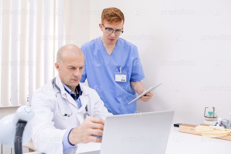 Зрелый уверенный врач, указывающий на дисплей ноутбука во время презентации