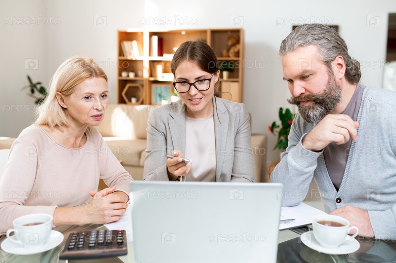 Зрелая пара смотрит на дисплей ноутбука, в то время как финансовый советник объясняет данные