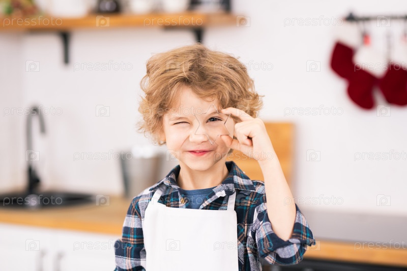 Счастливый милый маленький мальчик в фартуке, держащий звездообразная ножка у глаза