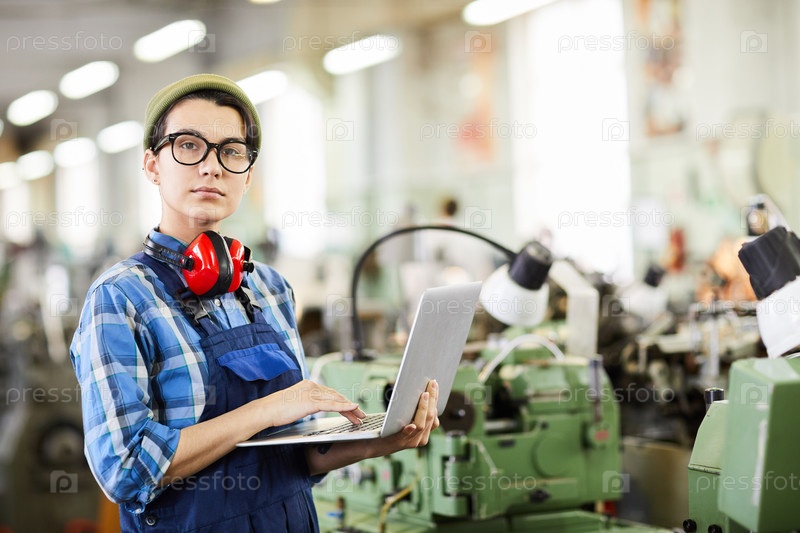 Серьезная умная молодая женщина с защитниками для ушей на шее стоит в промышленном магазине часовой фабрики и использует ноутбук, глядя на камеру