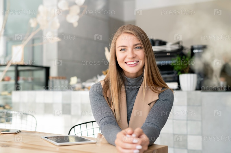 Счастливая девушка в умном casual сидит за столом в кафе перед камерой