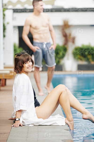 Красивая счастливая женщина, сидящая у бассейна