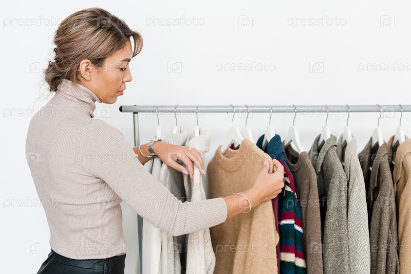 Случайная молодая женщина смотрит на бежевый свитер на стойке среди другой одежды