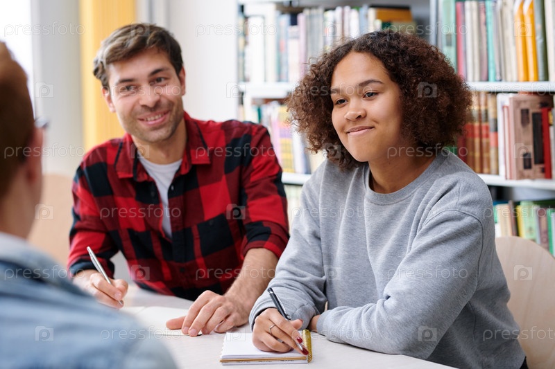 Счастливая мультикультурная студентка слушает одного из одноклассников