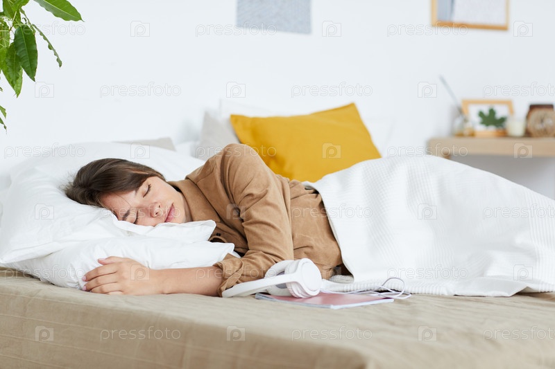 Усталая молодая студентка в рубашке спит под одеялом на кровати с наушниками и учебником