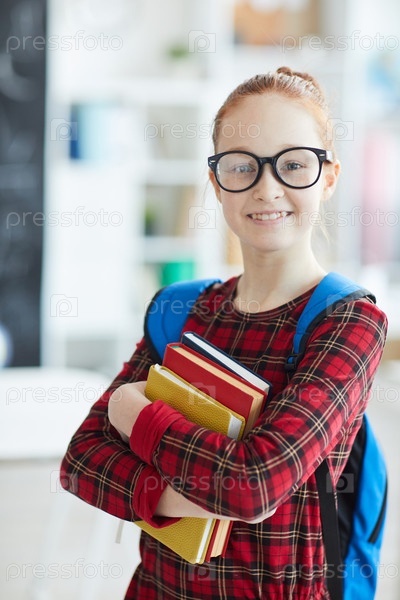 Портрет позитивной студентки в очках, носящей синий сумку на спине, стоящей в классе и держащей кучу книг