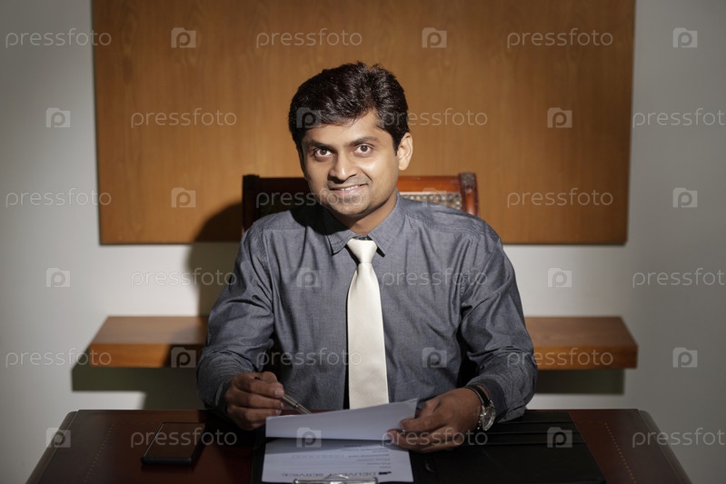 Улыбающийся бизнесмен, работающий с документами