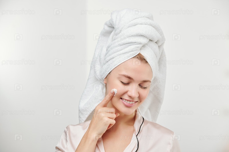 Красивая молодая удовлетворенная женщина наносит гидратирующий крем на лицо
