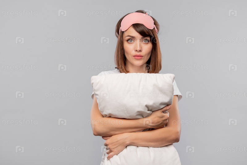 Молодая сонная женщина с подушкой, страдающая бессонницей или громкими соседями