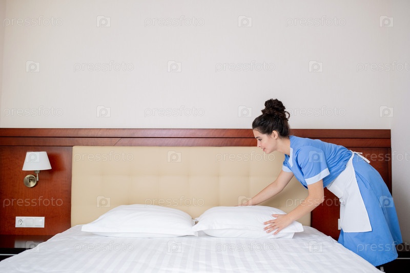 Красивая молодая женщина в униформе горничной стоит у кровати и меняет подушки