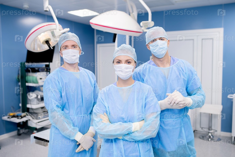 Команда из трех современных хирургов в масках, перчатках и защитной форме