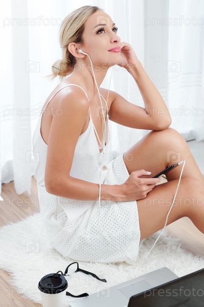 Вдумчивая женщина слушает подкаст