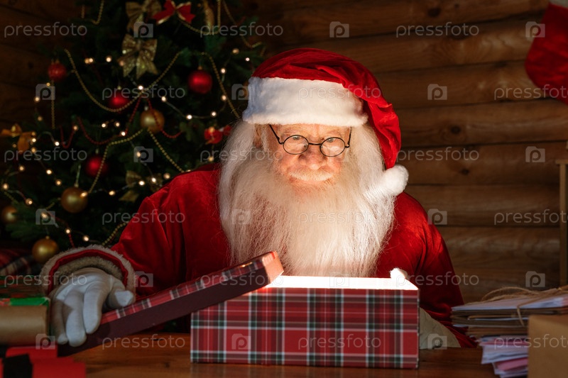 Счастливый Санта в костюме и очках открывает подарочный ящик с волшебным светом внутри